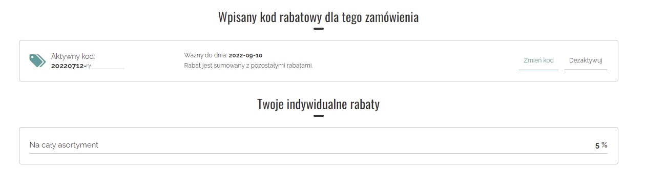 - jeżeli został wprowadzony kod rabatowy, możesz go zmienić lub dezaktywować klikając ZMIEŃ KOD lub DEZAKTYWUJ.