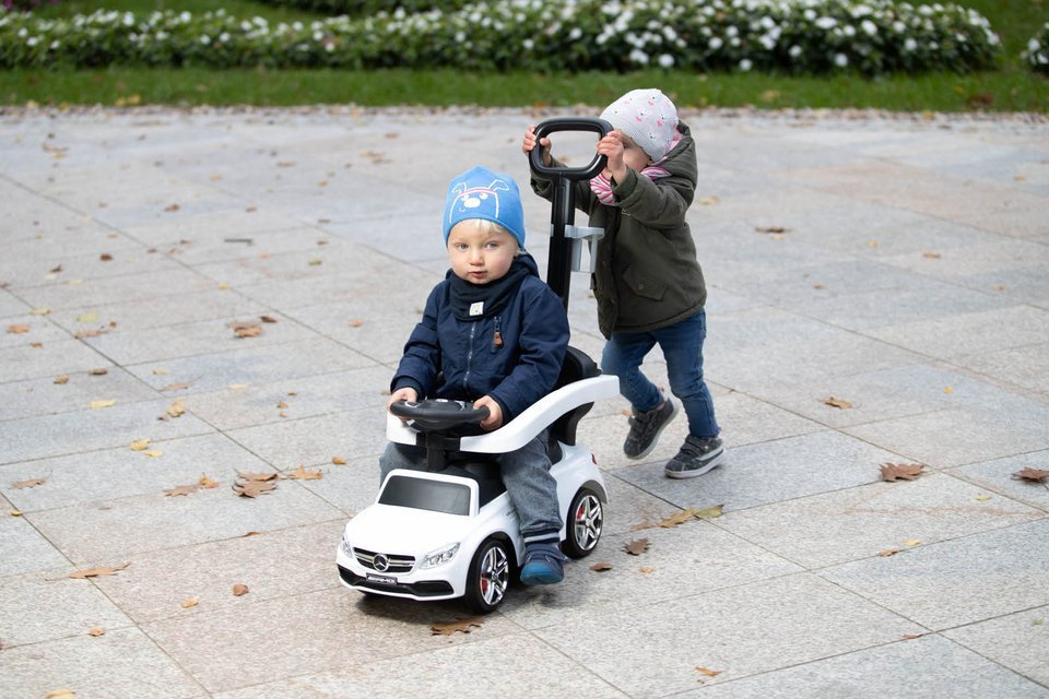 Dodatkowo mini Mercedes biały został wyposażony w prowadnik i poręcz zabezpieczającą, co jeszcze bardziej podnosi walory bezpieczeństwa. Oprócz walorów estetycznych warto zwrócić uwagę na stabilne koła z ogranicznikiem, stalowe osie oraz świetną interaktywną kierownicę z klaksonem i melodyjkami. Jeździk z prowadnikiem – Mercedes w kolorze białym to absolutny hit na rynku dla najmłodszych. Dzieci uwielbiają zabawki, które wpływają na ich motorykę i wyobraźnię. Ponadto pojazd dla najmłodszych został wyposażony w prowadnik z uchwytem na kubek lub butelkę, dzięki czemu pociecha ma pod ręką wszystko to, co w tak wczesnym rozwoju jest najważniejsze.