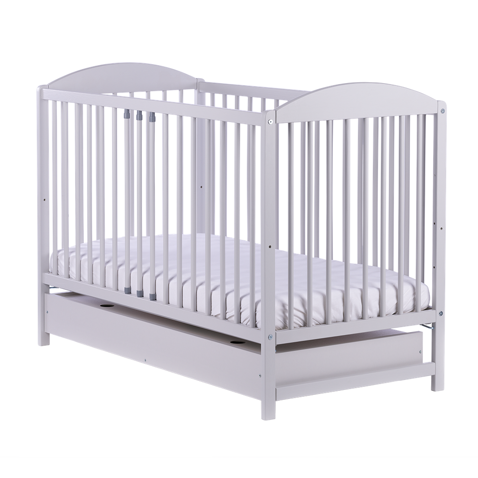 Szare łóżeczko dziecięce PETIT FOX z szufladą wykonane z drewna sosnowego i laminowanej płyty wiórowej. Drewniane łóżeczko dziecięce najwyższej jakości z szufladą i opcją zmiany na tapczanik. Do produkcji tego łóżeczka dla noworodka wykorzystano polskie materiały i surowce. Lakiery i farby posiadają oficjalne atesty i certyfikaty gwarantujące ich bezpieczny wpływ na zdrowie dzieci.