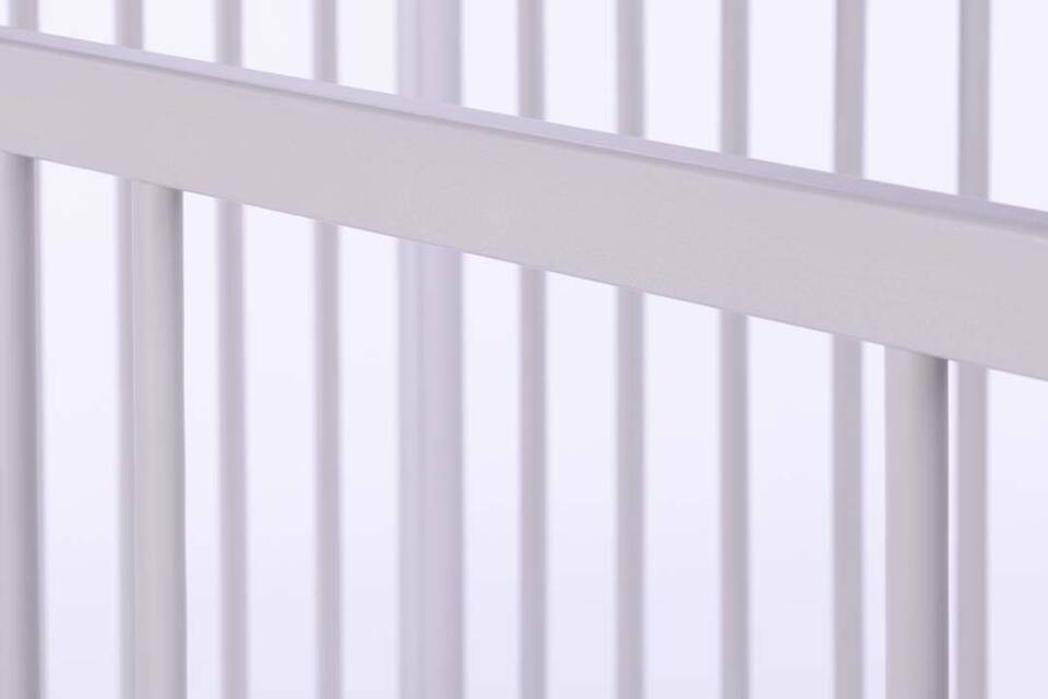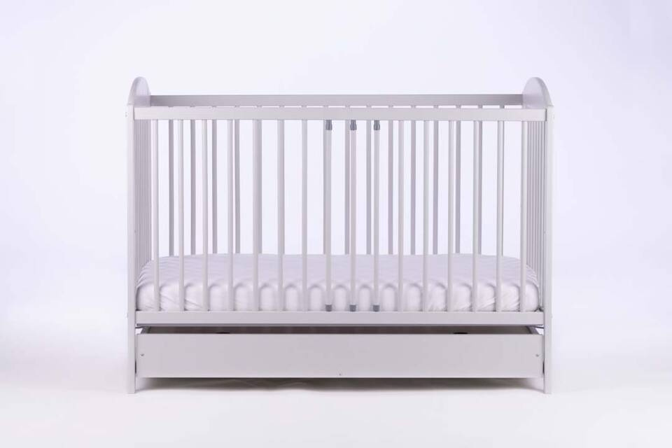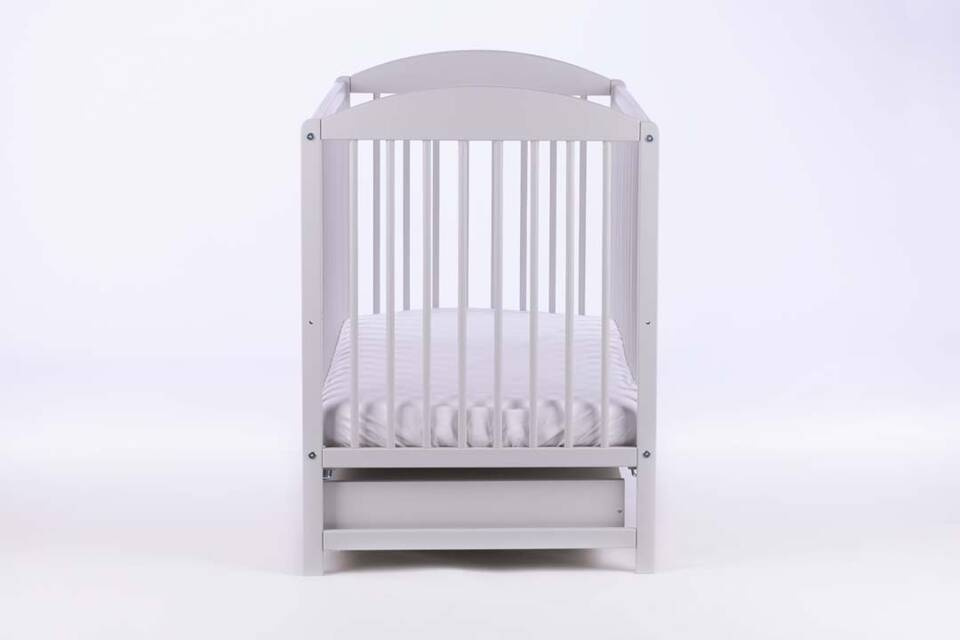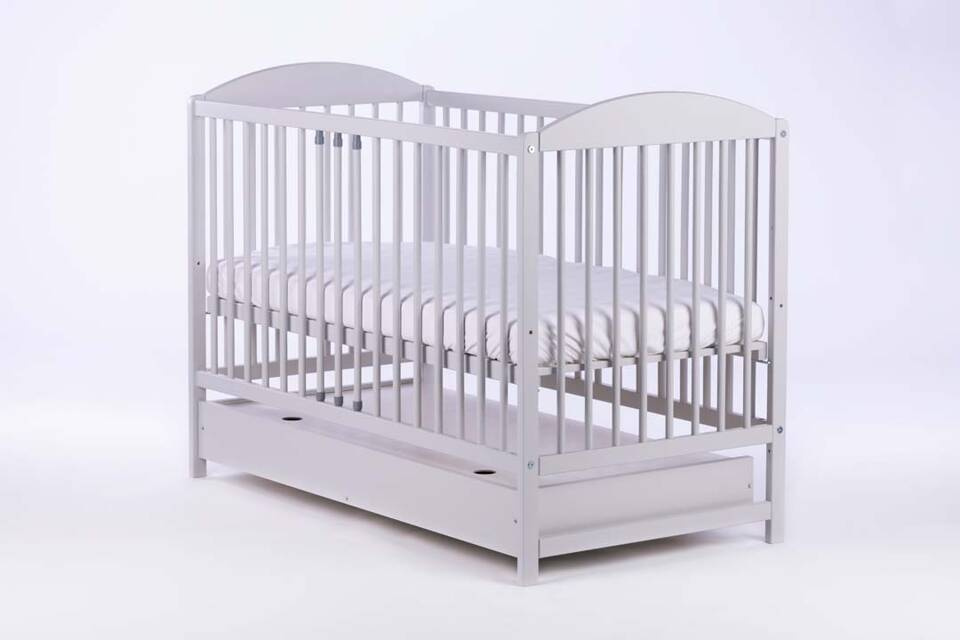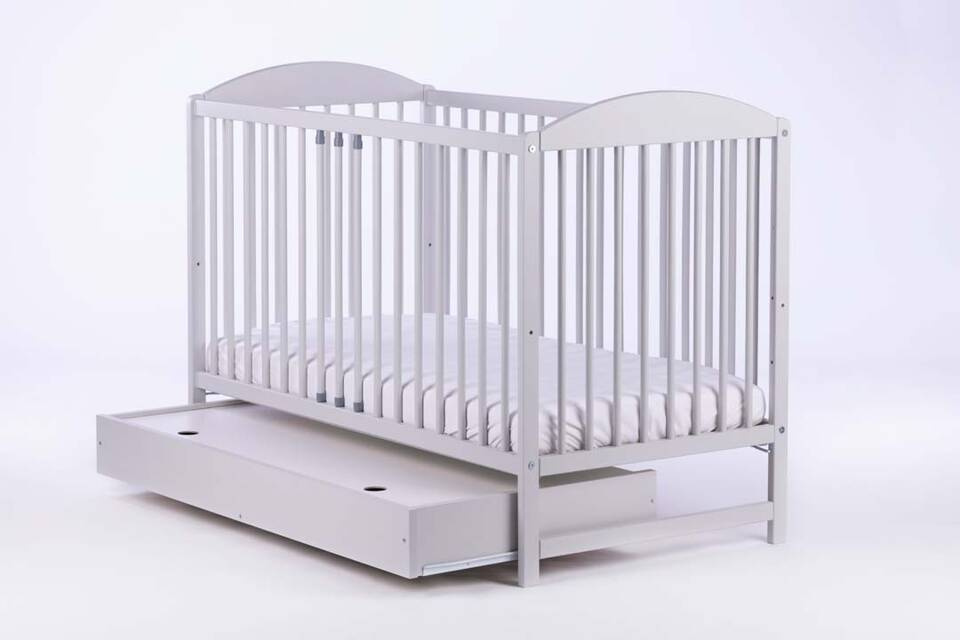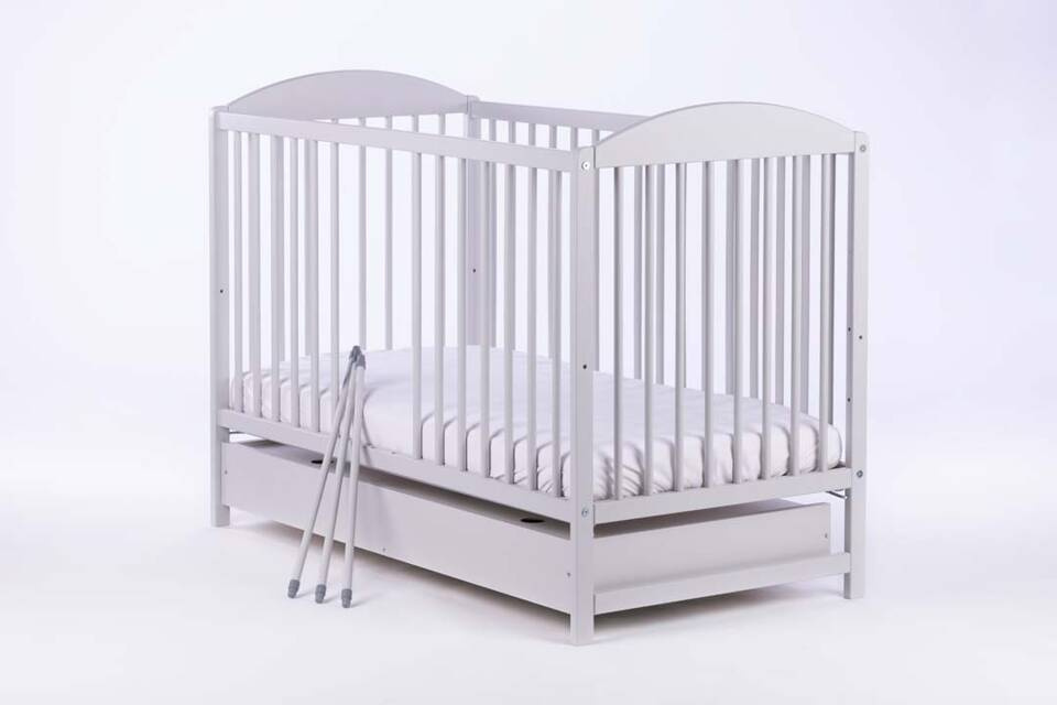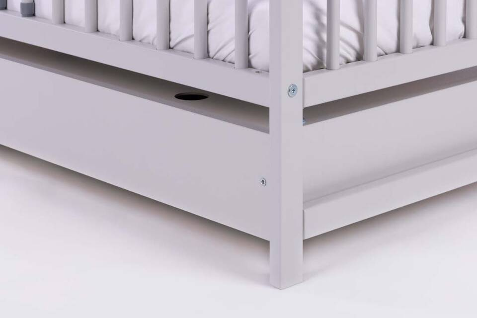 - Szare łóżeczko dziecięce szufladą wykonane z drewna sosnowego i laminowanej płyty wiórowej.